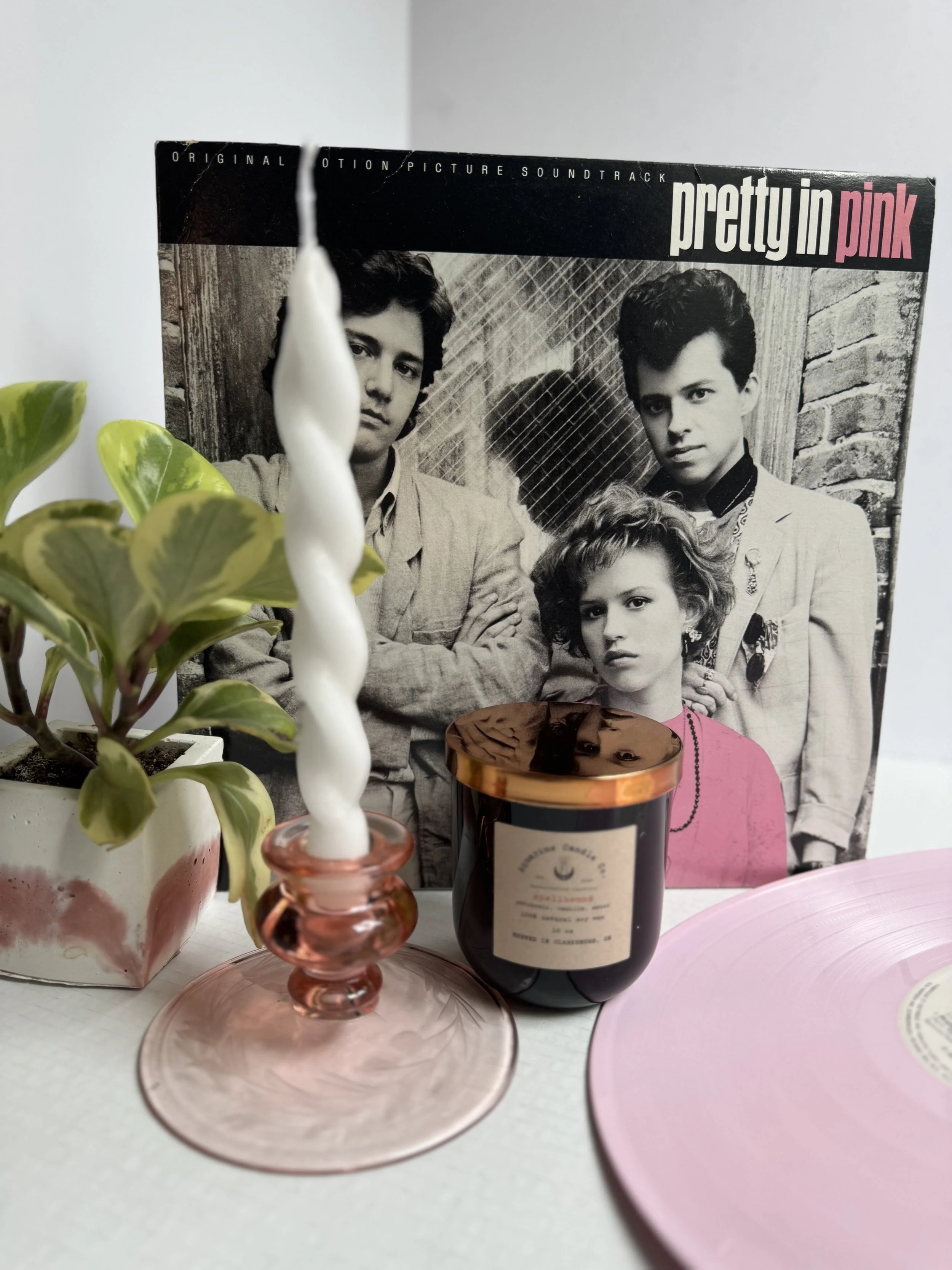 Vintage vinyl, a plant, pretty candle holder and candles make standout gifts.