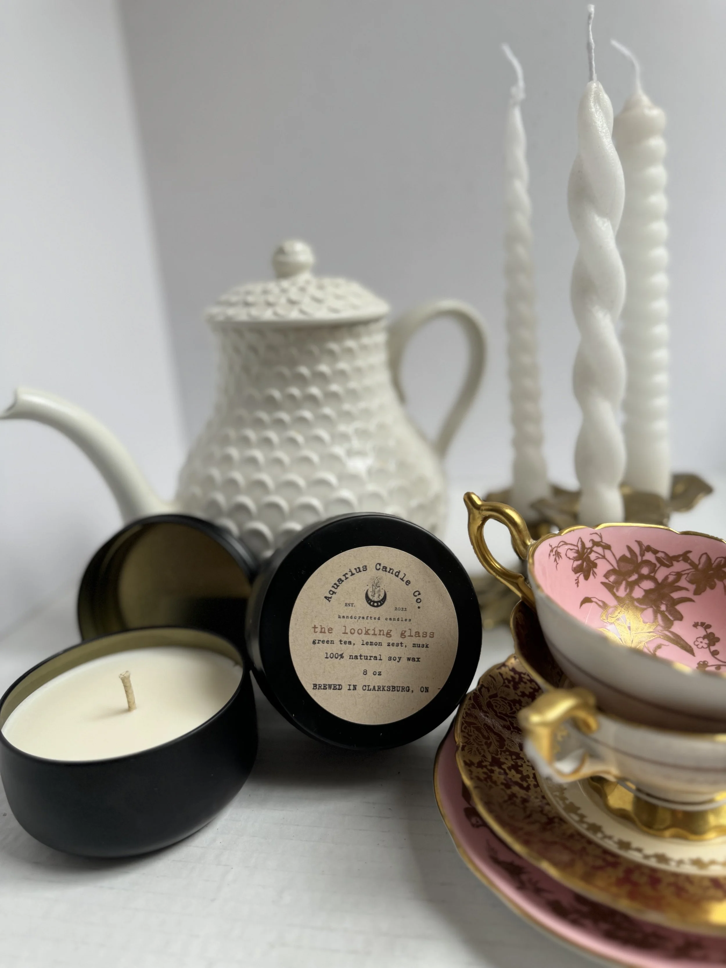 Cue the cozy with a vintage teapot, cups and saucers and taper candle holder, paired with Aquarius Candles.